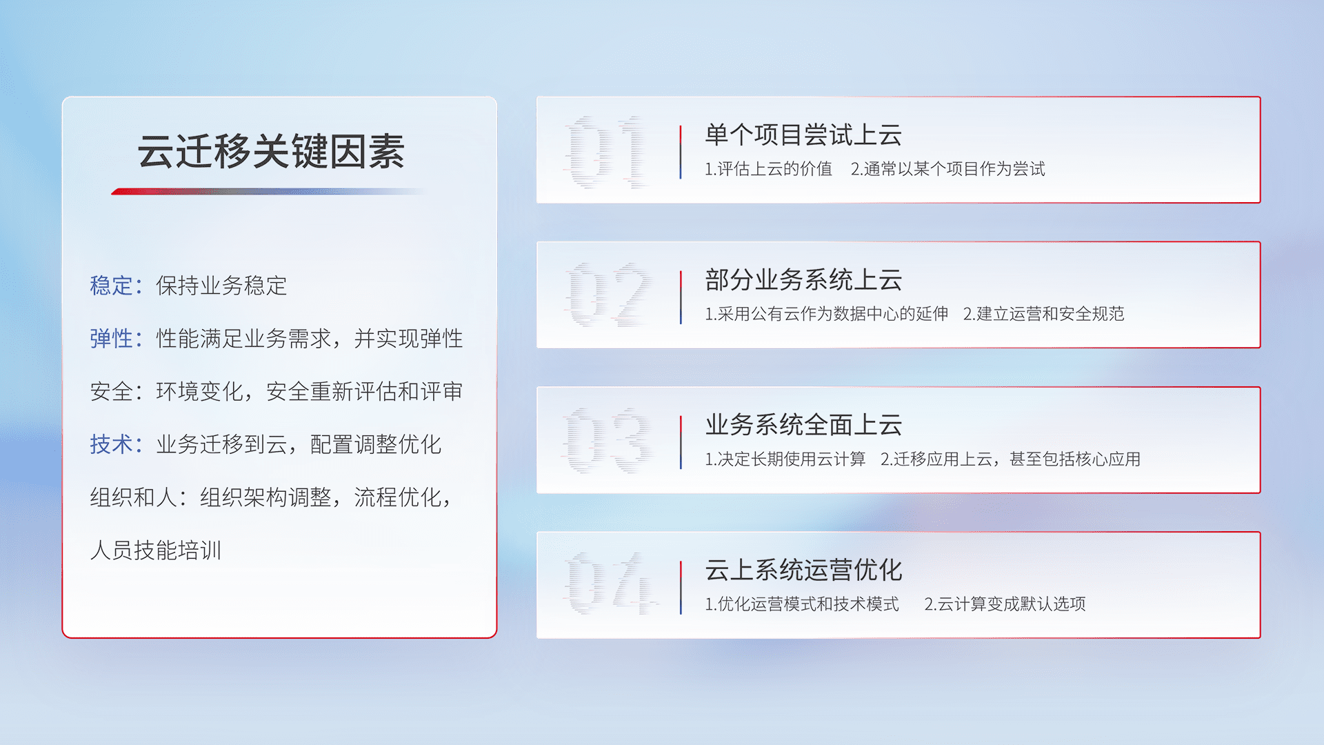 结合实际业务,,,,从规划设计、、云平台选型、、云原生改造、、、数据迁移、、集成交付,,迁移全过程为客户识别最佳上云路径,,做好风险识别管理,,,,设计网络架构、、、身份权限、、安全审计合规、、、操作审计、、、、日志审计、、、监控告警策略、、、、多站点容灾设计等,,,,对云上基础设施进行整体规划,,,提升IT治理水平,,,,以满足弹性、、高可用、、高性能的需求。。。