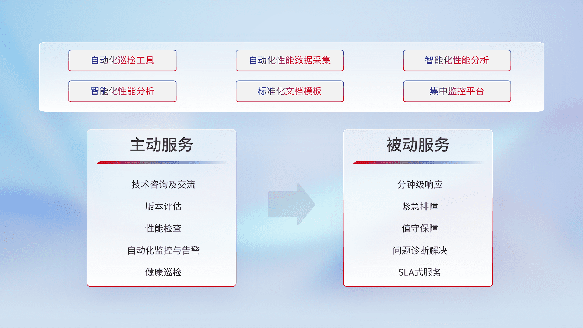 智能化工具和标准化文档,,,保障服务质量,,,提供主动服务(包含技术咨询、、、版本评估、、、、性能检查、、、、自动化监控与告警、、、健康巡检)和被动服务包含(分钟级响应、、、、紧急排障、、值守保障、、、、问题诊断解决、、SLA服务)。。。